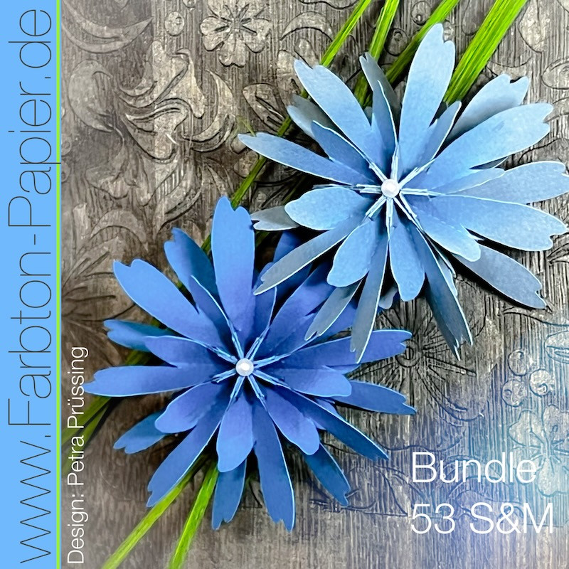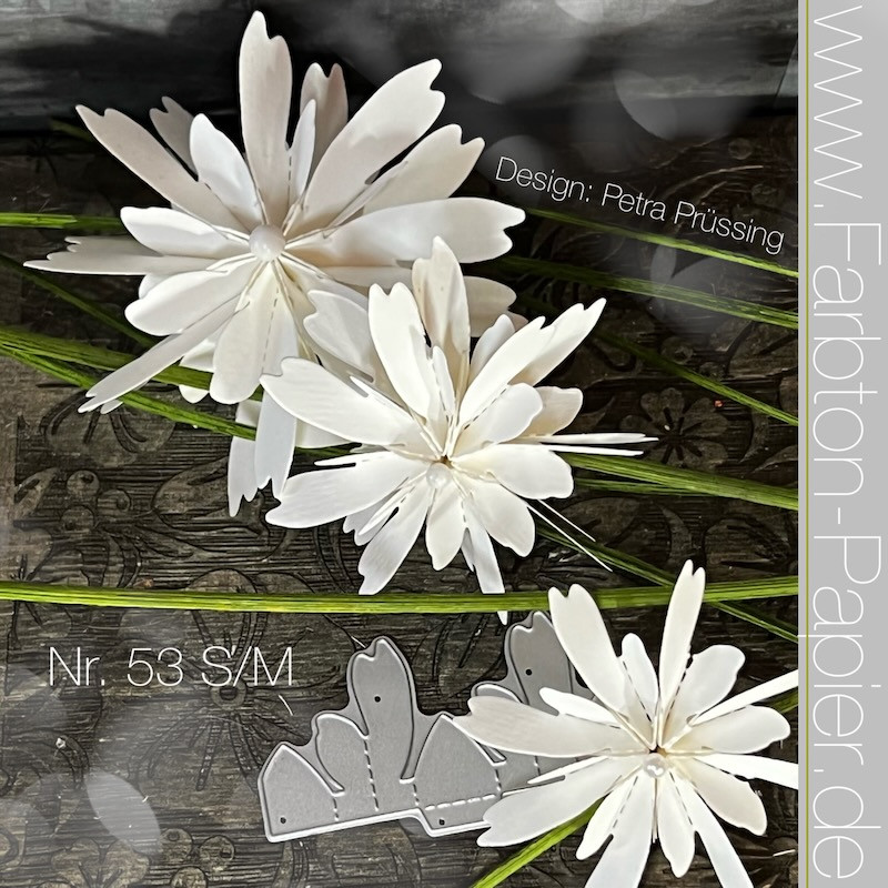 Assymetrische Blume Das Modell Nr.53 S Das Blütenblatt ist hier asymmetrisch und bekommt dadurch eine ganz neue Optik. Bei diesem Modell ist zu beachten, dass die Einzelteile immer in der gleichen Ausrichtung aufeinander geklebt werden, sonst bleibt alles wie gehabt. Eine bebilderte Anleitung ist auf jeder Stanze.Durchmesser der fertigen Blume ca....