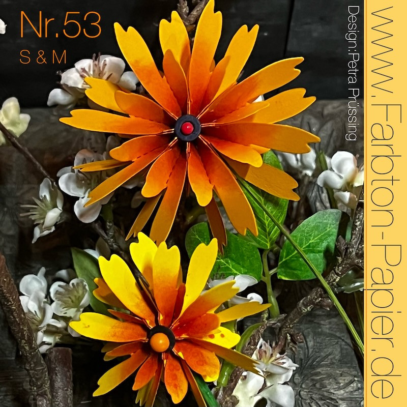 Assymetrische Blume Das Modell Nr.53 M Das Blütenblatt ist hier asymmetrisch und bekommt dadurch eine ganz neue Optik. Bei diesem Modell ist zu beachten, dass die Einzelteile immer in der gleichen Ausrichtung aufeinander geklebt werden, sonst bleibt alles wie gehabt. Eine bebilderte Anleitung ist auf jeder Stanze.Durchmesser der fertigen Blume ca....
