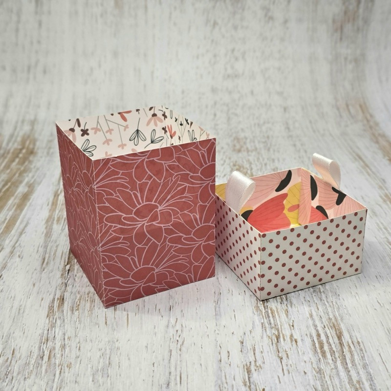 Bei der Doppelstockbox verbirgt sich im unteren Teil ein Geheimfach. Das obere Fach kann einfach an Bändern herausgezogen werden und offenbart so das zweite Fach. Die Box ist einfach zu bauen, du musst nur darauf achten, in welcher Reihenfolge du die Seite an das untere Fach klebst. Beginne an der Seite mit der Klebelasche.