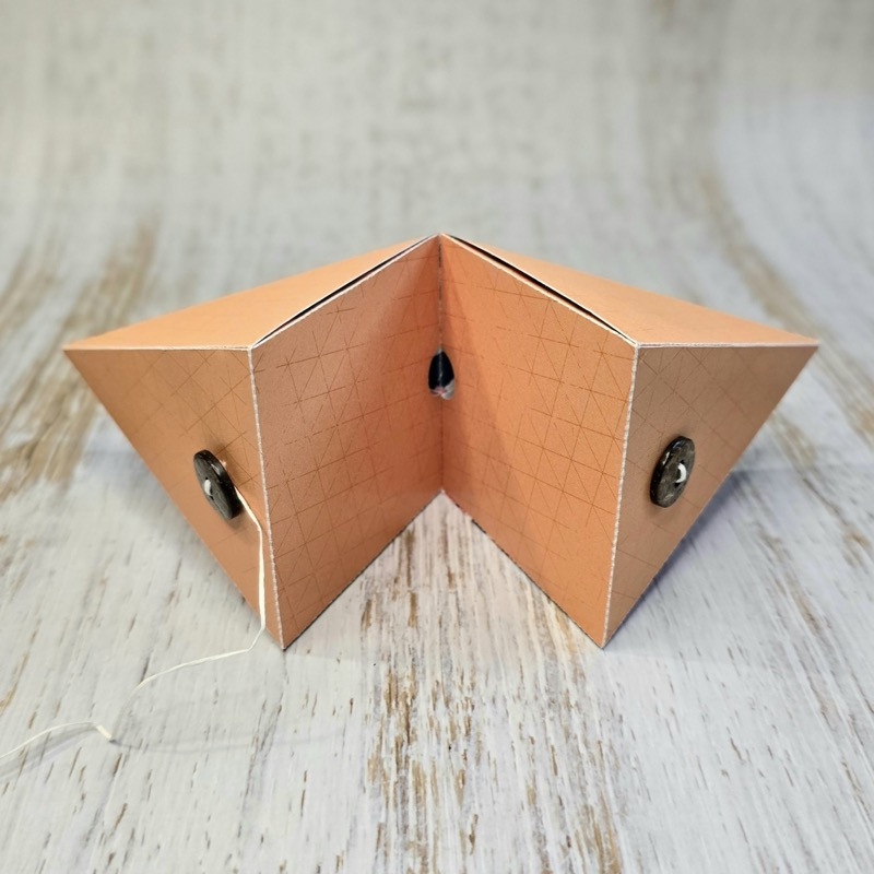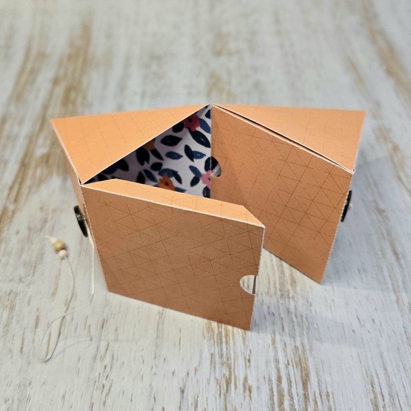 Die Form dieser Box sieht zwar etwas herausfordernder aus, sie ist aber einfach im Zusammenbau. Die Box wird in der Mitte auseinandergeklappt, wodurch zwei getrennte Pyramiden entstehen. Jede Seite kann separat geöffnet werden. Als Verschluss dient ein Band, dass um die beiden Knöpfe gebunden wird.