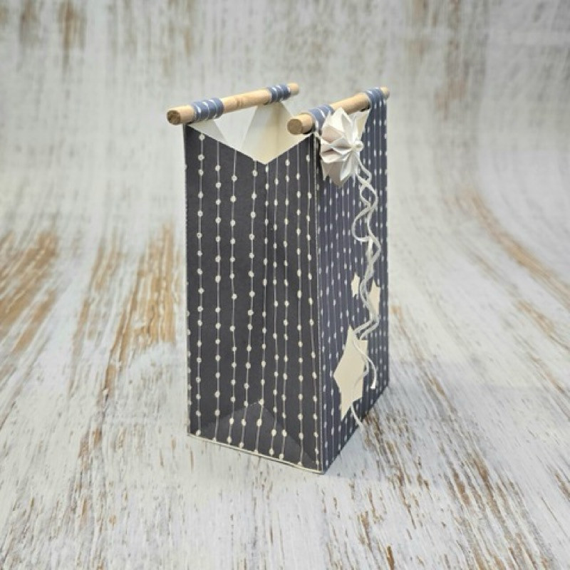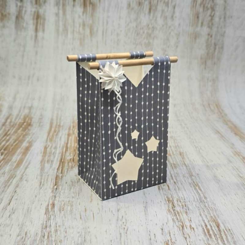Die Lichttüte kann zum einen als Geschenkverpackung und zum anderen als Windlicht genutzt werden. Der Zusammenbau ist einfach, doch bevor du sie zusammenklebst, sollten die Holzstäbchen in die Henkel eingerollt werden.