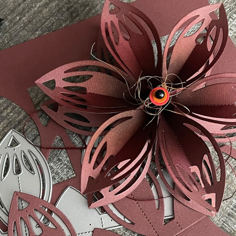 Die größte Faltblume mit einem Durchmesser von 32cm, die Stanze nimmt eine ganze DinA4 Seite ein.