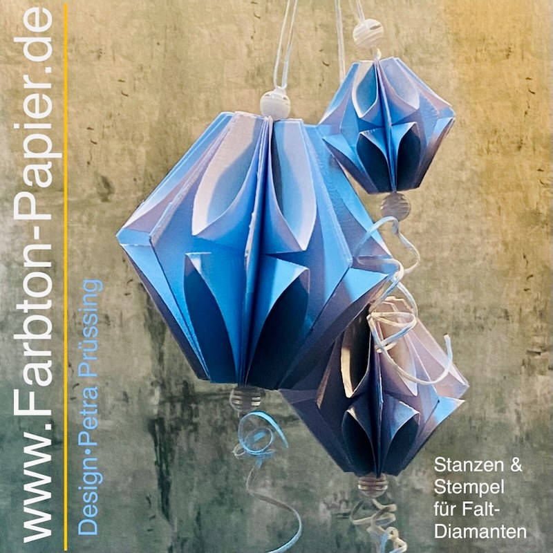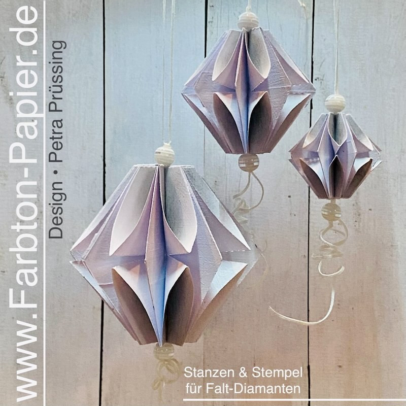 Großer Faltdiamant, der ganzjährig einsetzbar ist. Zum Hängen oder Legen, in verschiedenen Ausrichtungen aufgehängt, wirkt er immer anders, eine vielseitige Stanze mit vielen kreativen Möglichkeiten. Größe des fertigen Diamanten / Durchmesser: 7,0 cm / Höhe: 6,5cm