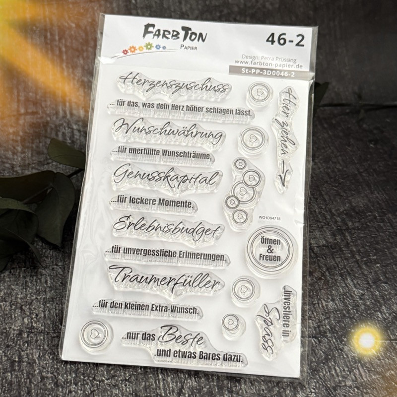 ist ein Set mit neuen Texten rund um Geldgeschenke. Immer ein Schreibschriftwort und ein Satz in Druckschrift gehört zusammen. Diese Stempel sind passend für die Box 195, das darin enthaltene Rechteck ist abgestimmt auf diese Stempel.