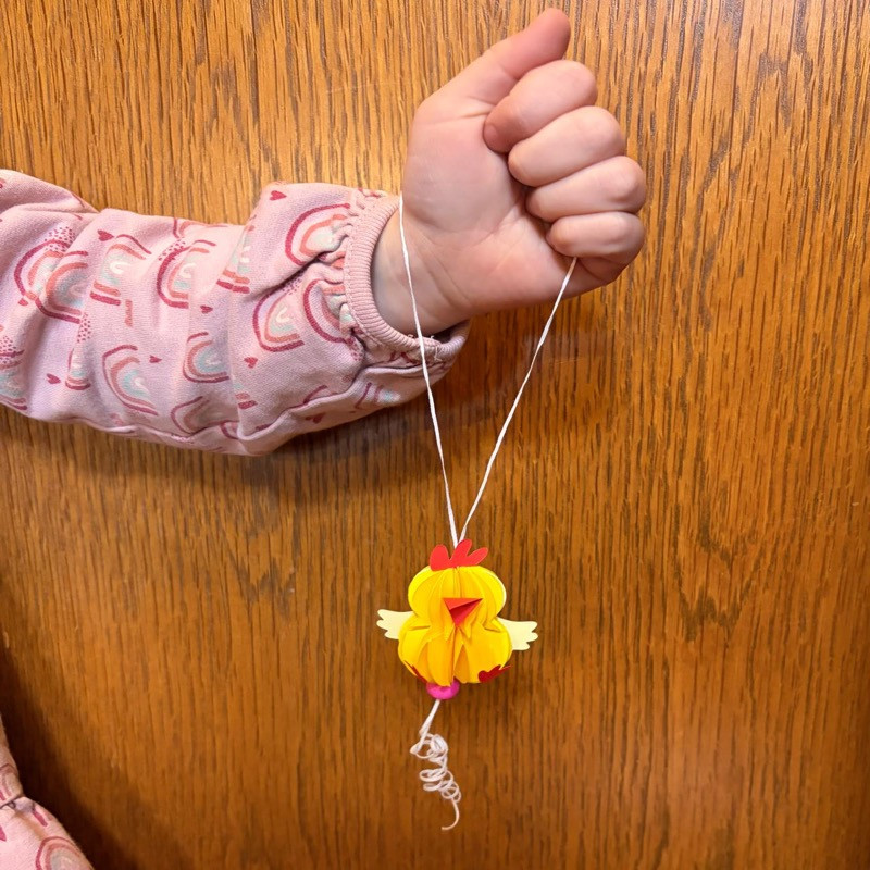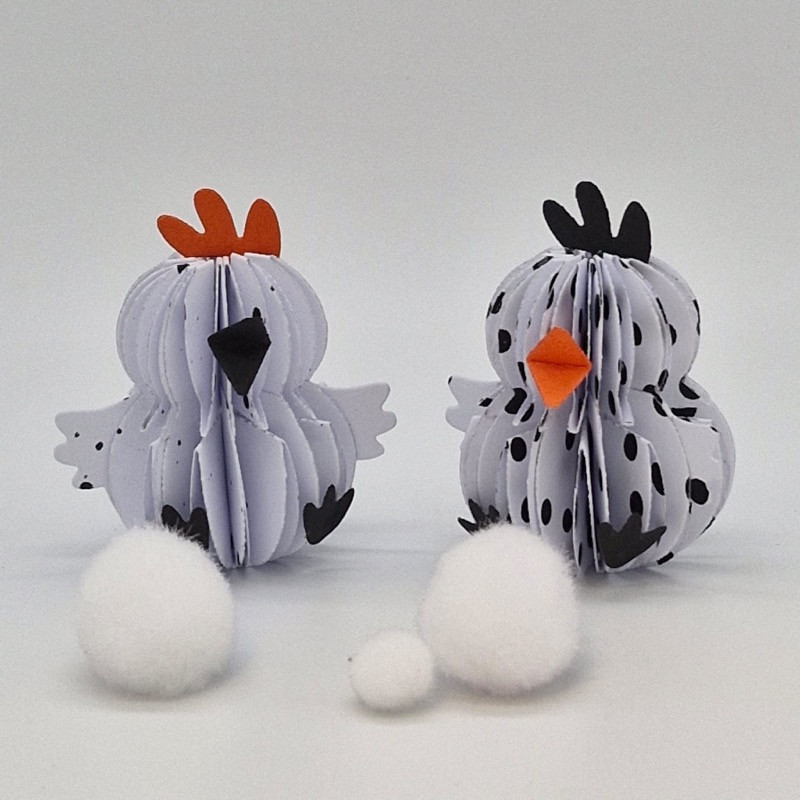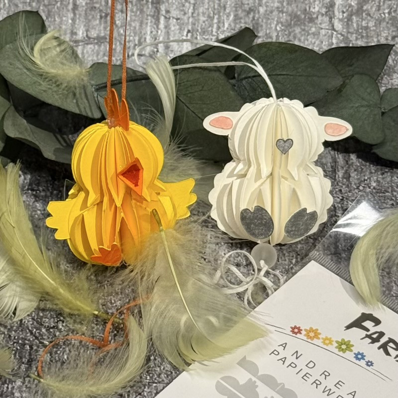 Einfach Papierfarbe wechseln und los gehts, statt Fell und Herzchen-Nase, werden Schnabel und Kamm angeklebt und lassen das Schaf zum Küken werden.