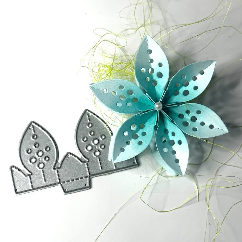 Ein zartes Punkte-Dekor, welches auch beim auseinanderfalten ein neues, luftiges Muster ergibt. Zu empfehlen sind 6 Stanzteile, dann wirkt die Blüte voll und schön aufgefächert, dass das Muster richtig zur Geltung kommt.
