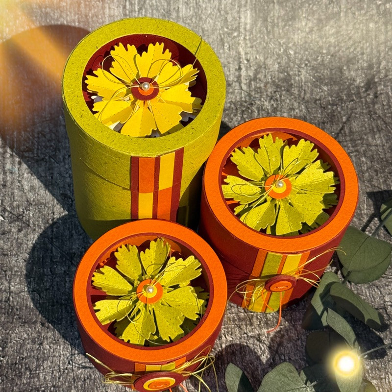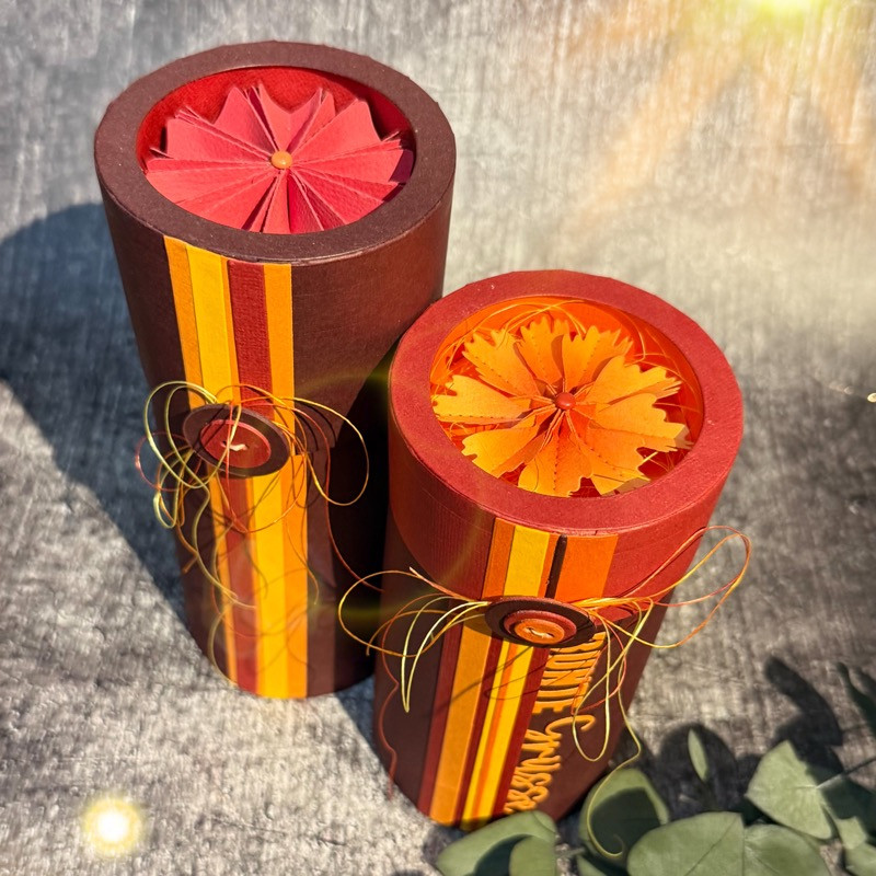 Runde Boxen mit eingebautem Fenster, bei denen der Durchmesser festgelegt ist, ihr aber die Höhe selbst bestimmen könnt. So habt ihr mit einer Stanze ganz verschiedene Boxen.