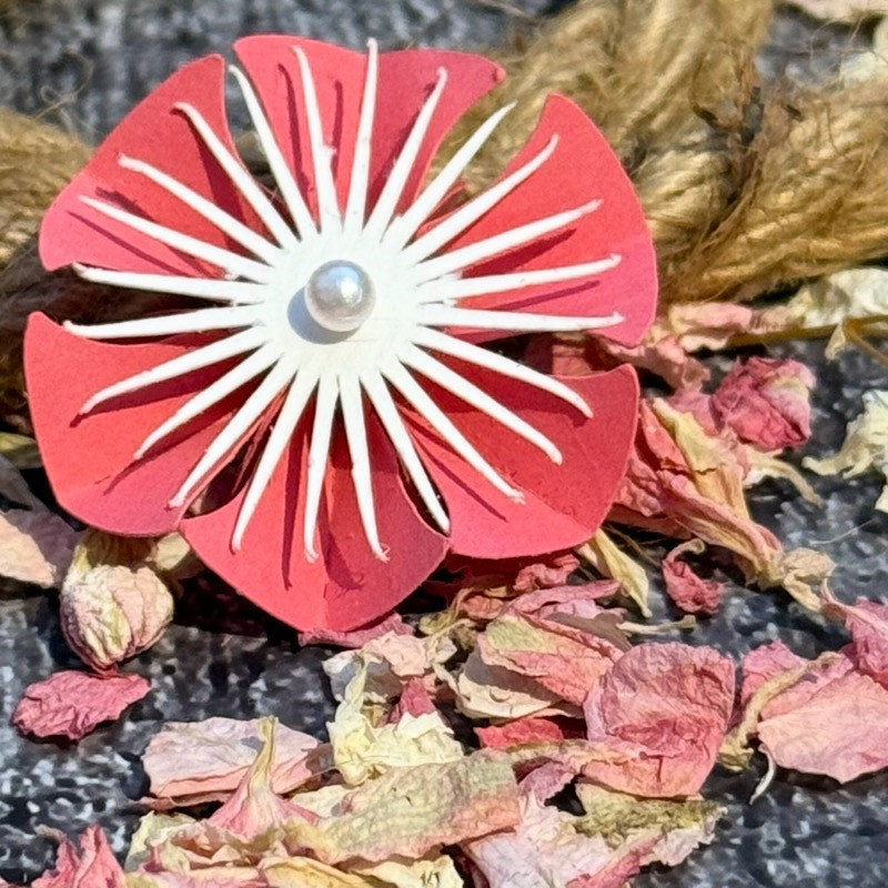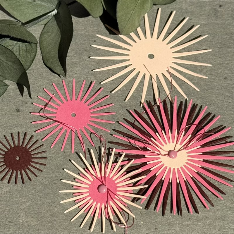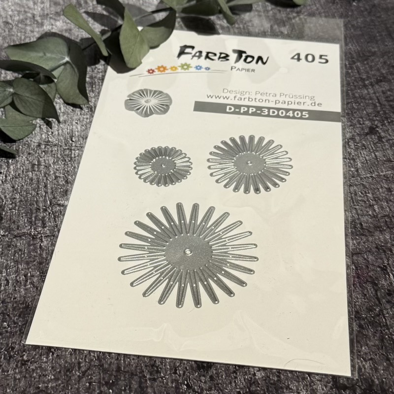 3-teiliges Set, passend zusammengestellt für unsere Faltobjekte, die Blumen in verschiedenen Größen, haben schon ein mittig gestanztes Loch und passen so ganz einfach, symmetrisch aufeinander.